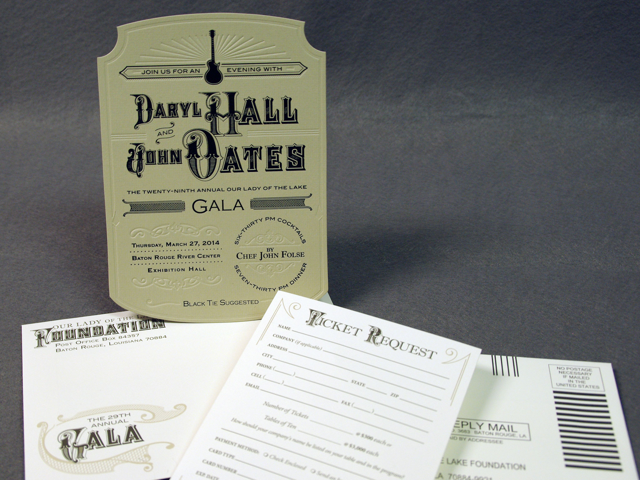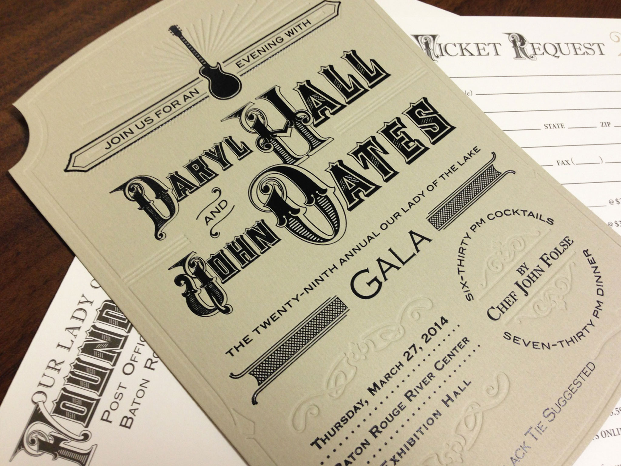Matte-black foil, alternating embossed and debossed ornamentation, and leather-like Classic Crest cardstock invite Baton Rouge’s elite to an evening gala featuring the classic American rock of Hall and Oates.