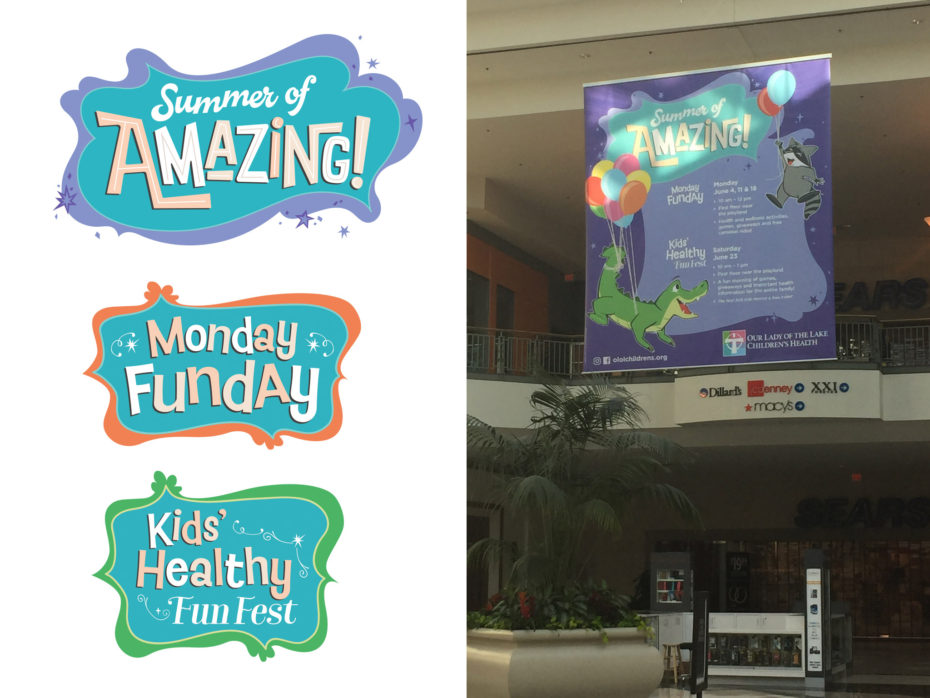 “Summer of Amazing” was the 2018 FMOL Children’s Health mini-campaign that offered educational events online and in the Mall of Louisiana in Baton Rouge. I oversaw all marketing collateral and personally illustrated the three event seals for the overall summer, “Monday Funday” events, and the “Kids’ Healthy Fun Fest” culmination. I also illustrated the alligator, raccoon, and fox used throughout the assets.