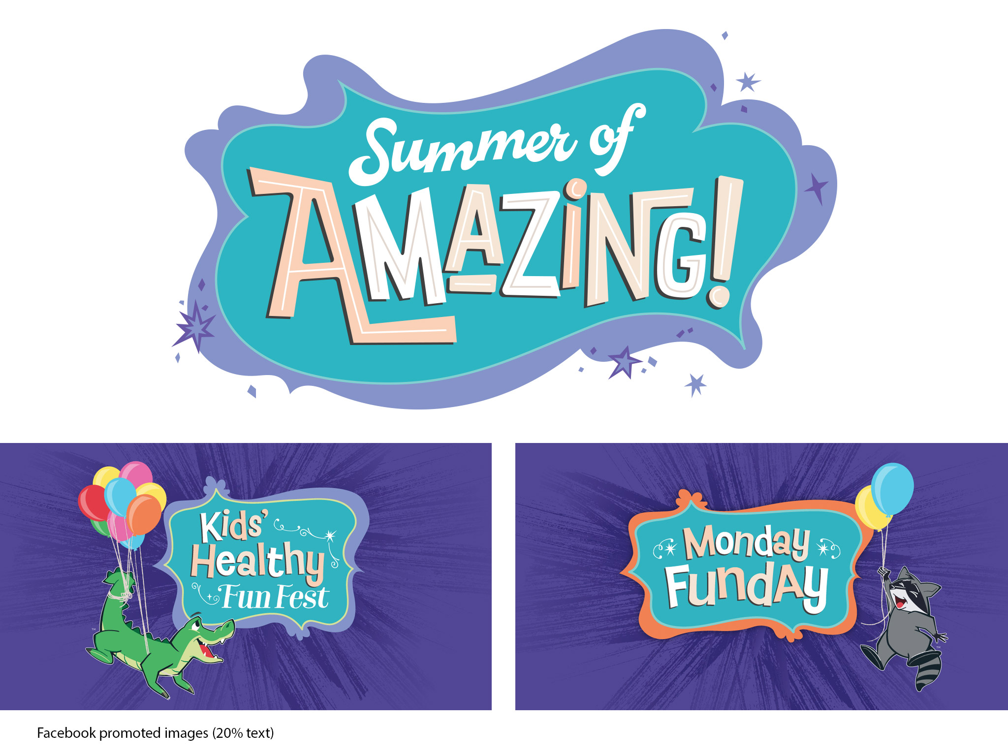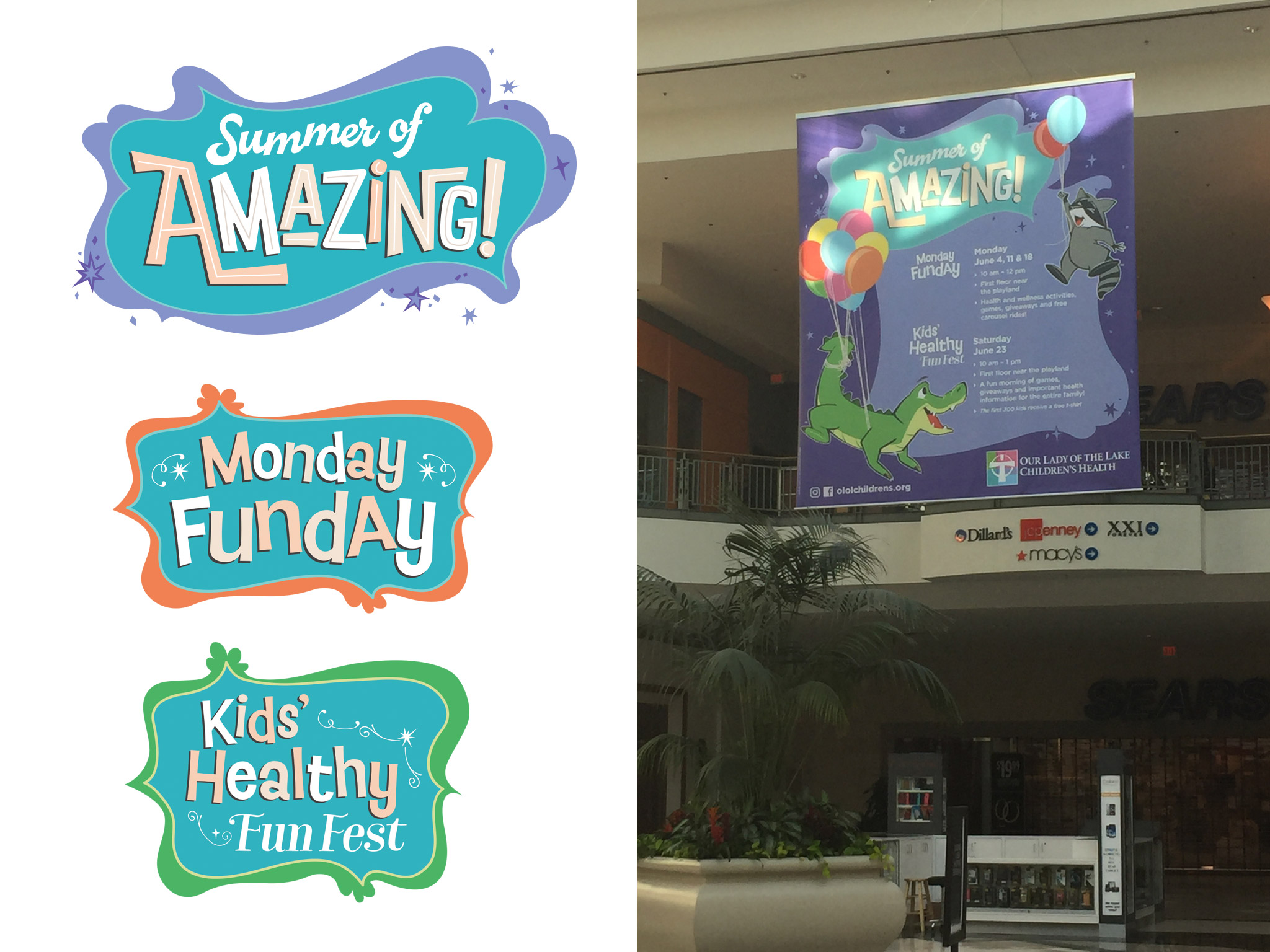 “Summer of Amazing” was the 2018 FMOL Children’s Health mini-campaign that offered educational events online and in the Mall of Louisiana in Baton Rouge. I oversaw all marketing collateral and personally illustrated the three event seals for the overall summer, “Monday Funday” events, and the “Kids’ Healthy Fun Fest” culmination. I also illustrated the alligator, raccoon, and fox used throughout the assets.