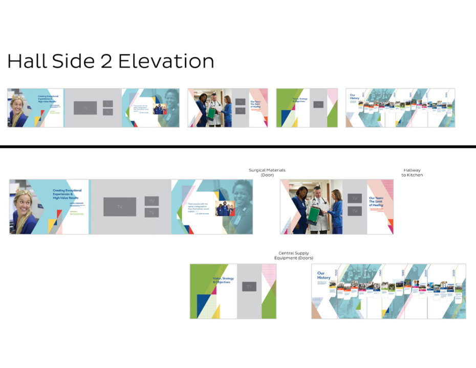 Considering the hefty budget, I designed this multimedia hallway to allow areas of instant updates. High-impact, scratch-resistant wall coverings feature long-term content such as the organization’s mission and values, and showcase diversity and roles throughout the hospital. A series of nine screens recessed in metal protective casings will constantly be updated with the latest dashboards, hospital scores, patient “Thank-You” letters, team photos, and important announcements.