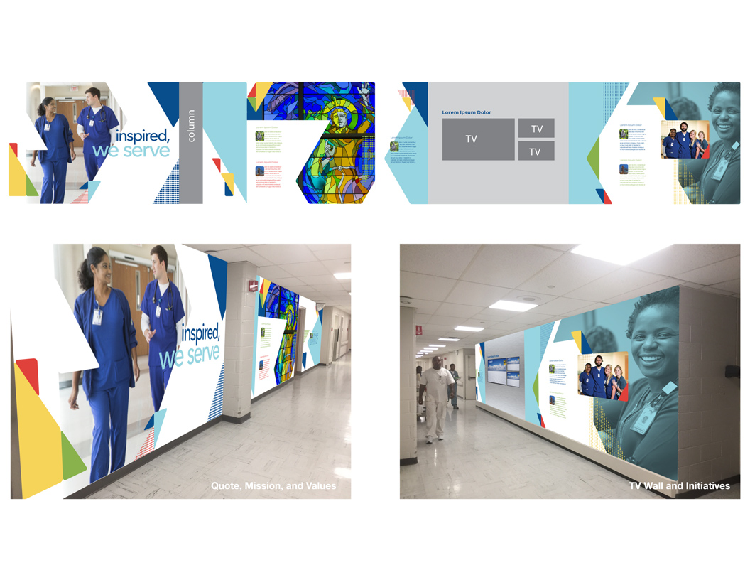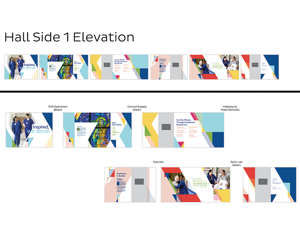 Considering the hefty budget, I designed this multimedia hallway to allow areas of instant updates. High-impact, scratch-resistant wall coverings feature long-term content such as the organization’s mission and values, and showcase diversity and roles throughout the hospital. A series of nine screens recessed in metal protective casings will constantly be updated with the latest dashboards, hospital scores, patient “Thank-You” letters, team photos, and important announcements.
